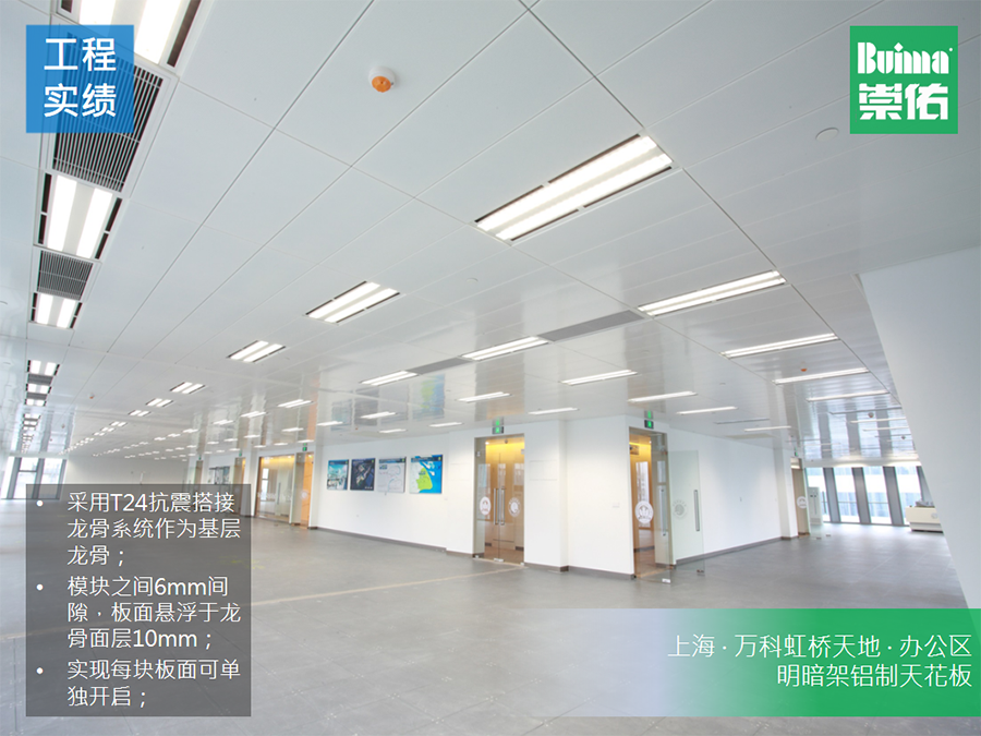 崇佑(中國)的這款明暗架天花系統(tǒng)的板面可采用鋼制天花板也可采用鋁制天花板,可以根據(jù)設(shè)計師對空間不同的述求進行選擇。如需防火時效,則采用鋼制天花板;如需輕便且對防火要求不高,則采用鋁制天花板。這個明暗架系統(tǒng)天花可以做組合式天花吊頂系統(tǒng)的結(jié)構(gòu),可以通過300*300(mm)、300*1200(mm)、400*1200(mm)、600*1200(mm)、1200*1200(mm)這些尺寸,來滿足設(shè)計師對空間不同功能區(qū)的劃分。再者,這款天花系統(tǒng),采用了明架系統(tǒng)的優(yōu)勢,就是龍骨系統(tǒng)本身是抗震防火龍骨,可以廣泛應(yīng)用于地震帶項目或者對防火時效有要求的場所;另外又結(jié)合了暗架系統(tǒng)的優(yōu)勢,便利拆卸安裝且自帶防風(fēng)結(jié)構(gòu),這樣就不會存在因為空間氣流問題而突然被掀翻的天花板砸到人的問題。